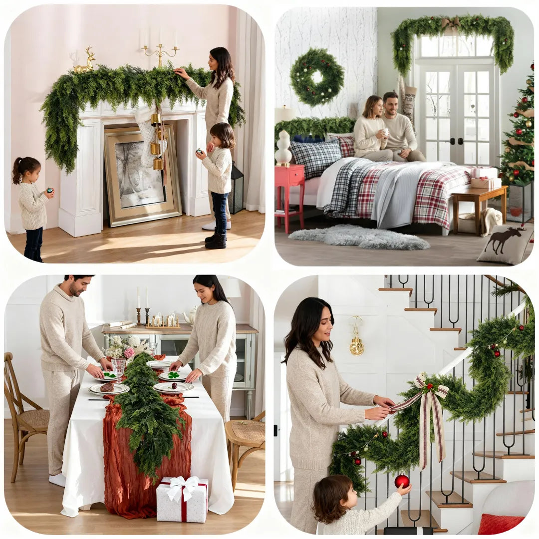 The Everlyn™ 6FT Real-Touch Cedar Garland adds instant warmth and style to any room. Its 180 cm length fits mantels, tables, staircases, or doorways with ease. Crafted with realistic cedar texture, deep green tones, and a durable hanging hook, it delivers a natural winter vibe that lasts season after season — no fading, no mess, just timeless beauty.